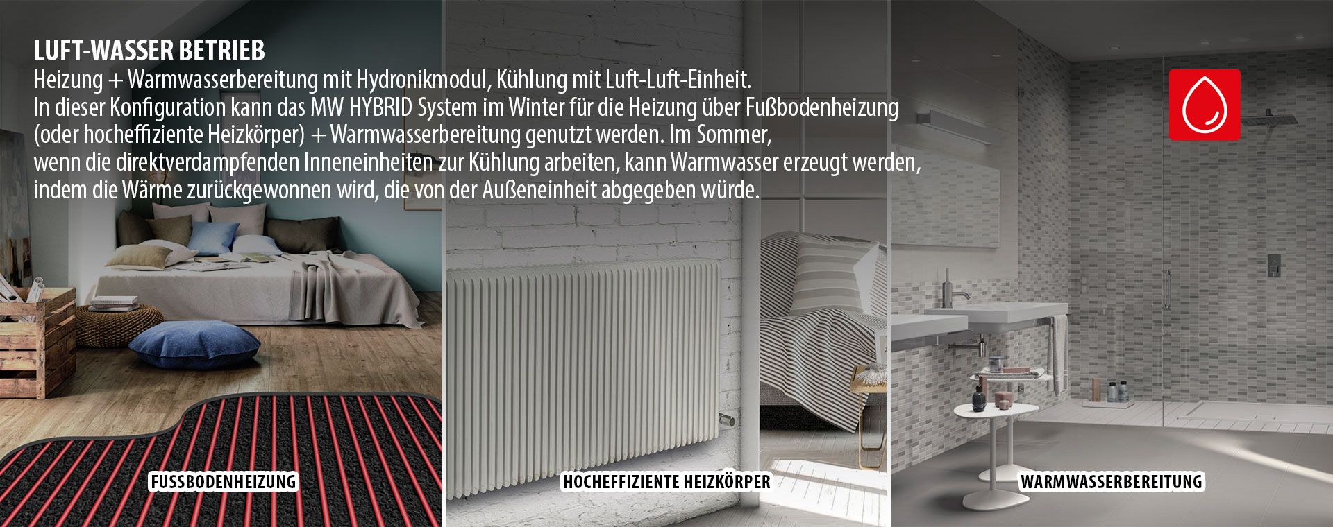 Die ideale Lösung für Wohn- und Gewerbegebäude kombiniert eine Luft-Wasser-Wärmepumpe mit einer Luft-Luft-Außeneinheit für den gleichzeitigen Betrieb von Klimatisierung und Warmwasserbereitung. Die integrierte Wärmerückgewinnung ermöglicht die Erzeugung von Warmwasser während des Kühlbetriebs mit einer auf dem Markt unübertroffenen Effizienz.