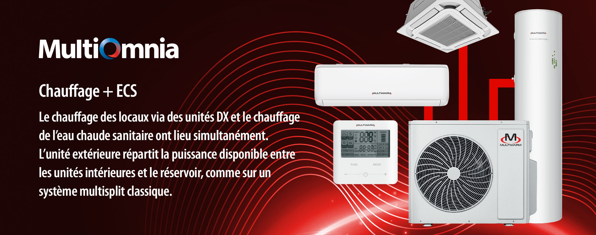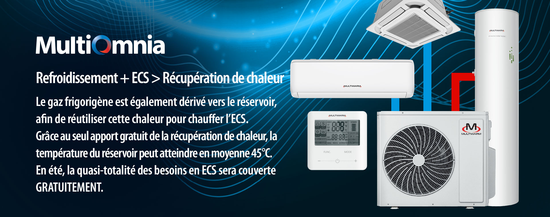 La gamme Multisplit Multiwarm s’élargit, avec deux unités extérieures pouvant être raccordées à la fois à des unités intérieures classiques et à un réservoir de 185 L pour la production d’ECS. Chauffage, refroidissement et production d’ECS pour le résidentiel avec une seule unité extérieure. Possibilité de produire de l’ECS gratuitement en période estivale grâce à la récupération de chaleur pendant le fonctionnement en refroidissement des unités intérieures air/air.